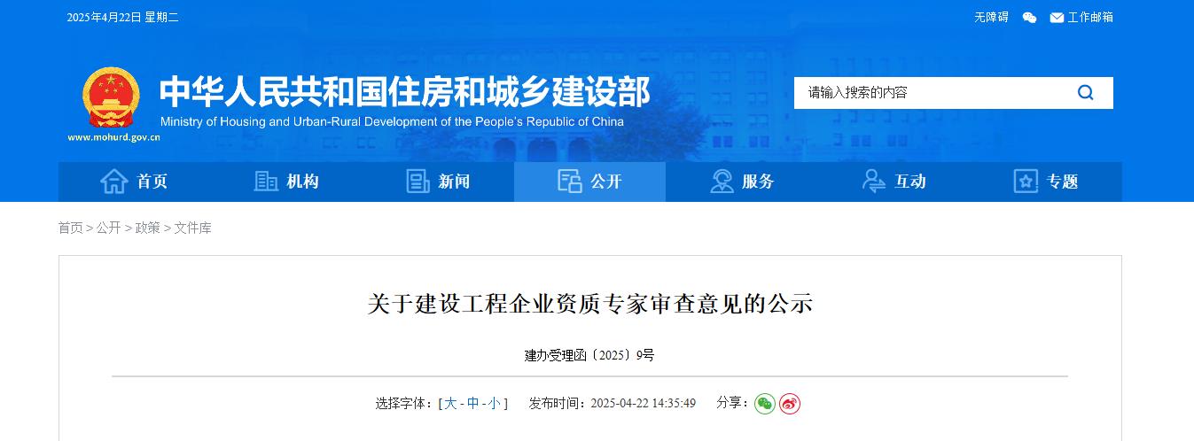 按照《行政许可法》及有关建设工程企业资质管理规定,我部对近期申请建设工程企业资质的申报材料组织了专家审查,现将专家审查意见在住房城乡建设部门户网站(https://www.mohurd.gov.cn)予以公示,以广泛接受社会监督。企业申报材料中的人员、代表工程业绩等详细情况,可通过点击“住房城乡建设部门户网站→建设工程企业资质行政审批专栏→资质申报基本信息公示”进行查询。