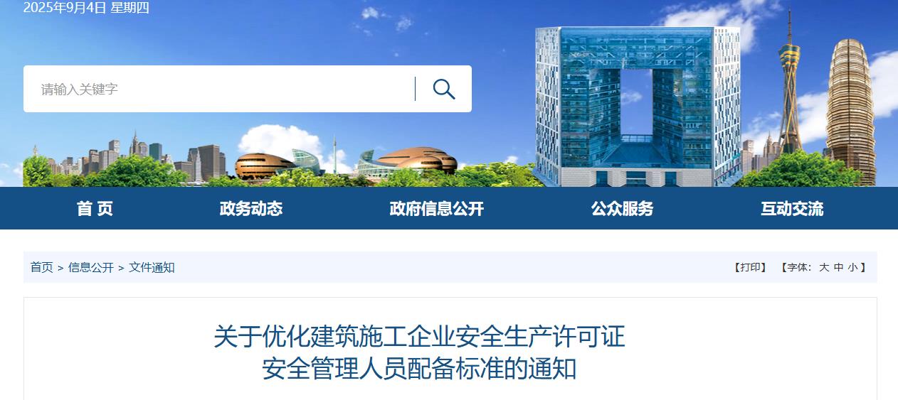 为深入贯彻《河南省优化营商环境条例》精神,优化我省建筑市场营商环境,提升政务服务效能并强化安全生产主体责任,根据《安全生产许可证条例》《建筑施工企业安全生产许可证管理规定》《建筑业企业资质标准》《关于简化建筑业企业资质标准部分指标的通知》《关于进一步加强建设工程企业资质审批管理工作的通知》《建筑施工企业安全生产管理机构设置及专职安全生产管理人员配备办法》等文件规定,决定对建筑施工企业办理安全生产许可证新申请、延期申请以及批后核查等涉及的安全管理人员配备标准予以优化。自2025年10月1日起按本通知要求执行。